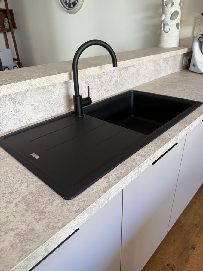 Belle cuisine Bi-colore avec des façades satin et graphite. Un plan de travail stratifié effet granit beige, avec relief pailleté. Un ensemble harmonieux et original.